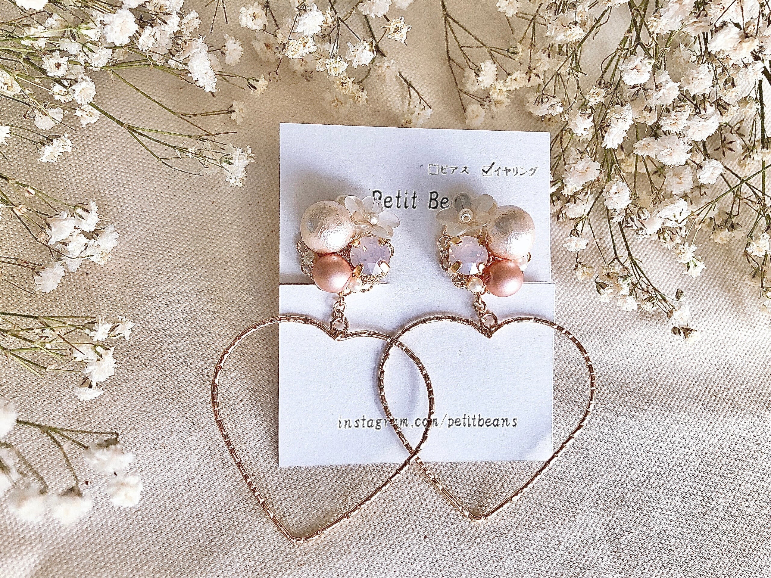 淡いピンクのスワロフスキーとコットンパール 、お花のパーツと、ゆらゆらする大きめのハートで、かわいいデザインになっています。