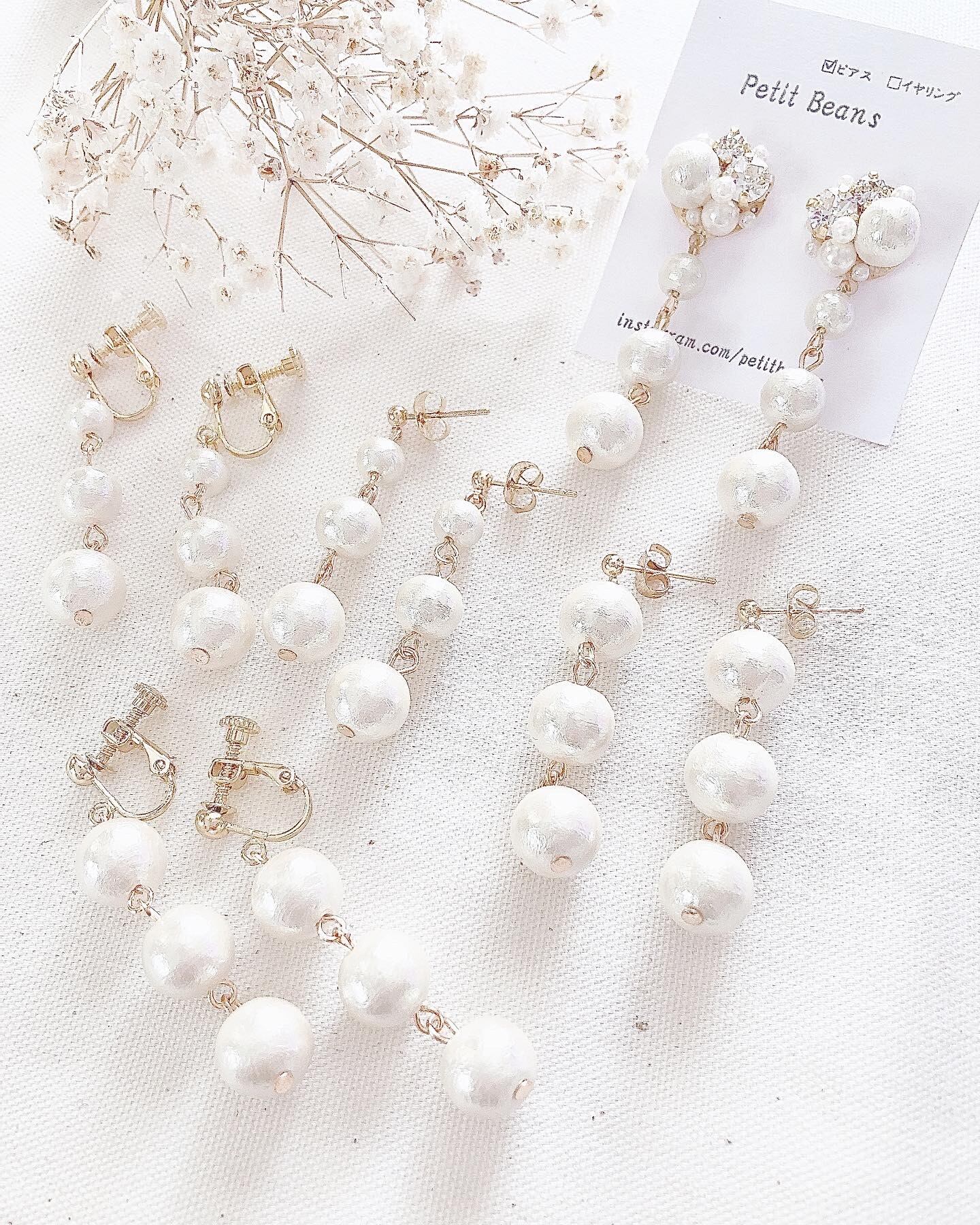 大きめコットンパールを使ったロングピアスとロングイヤリング ☺︎