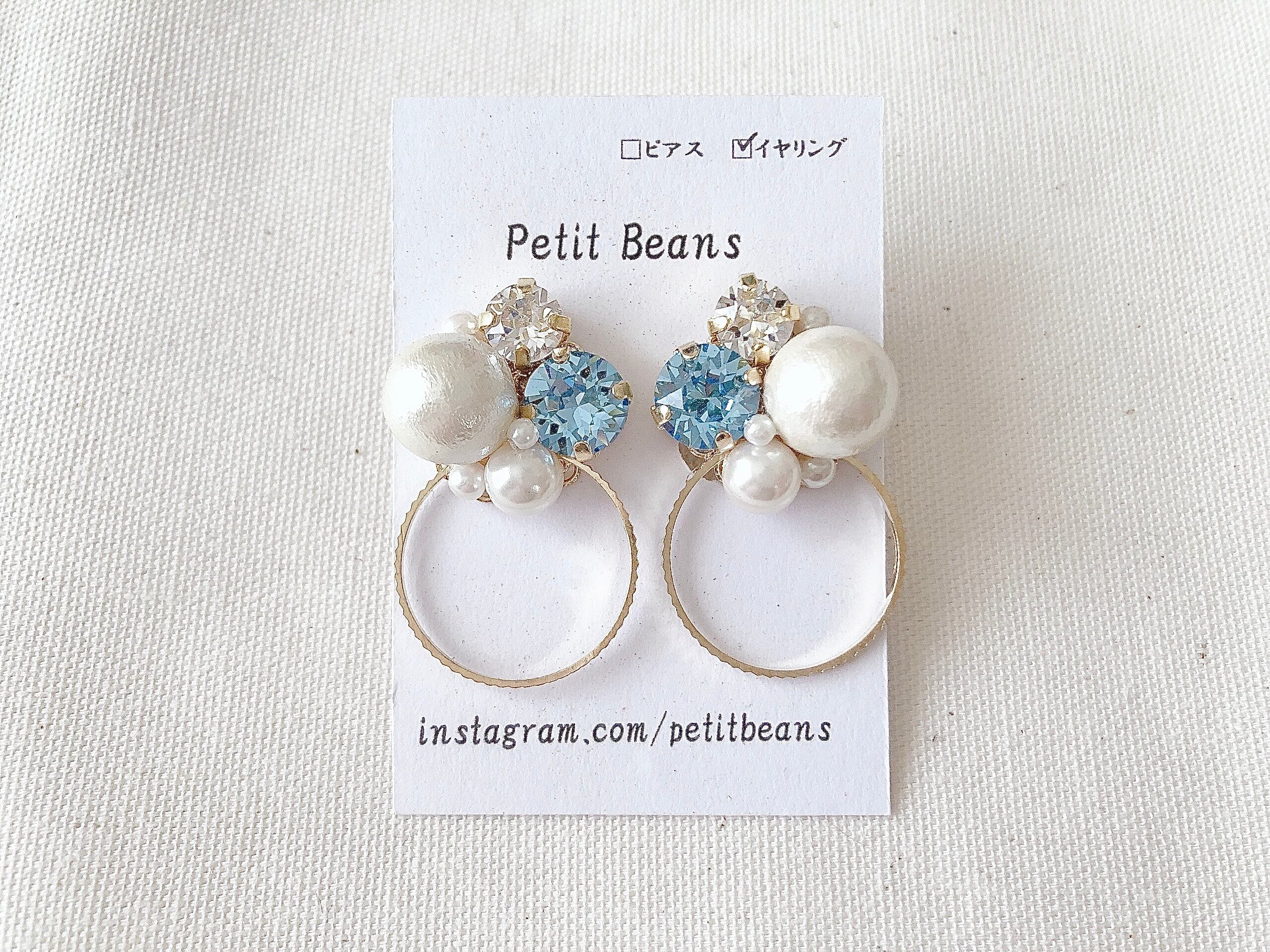 アクアマリン×フープ★イヤリング ハンドメイド スワロフスキー コットンパール