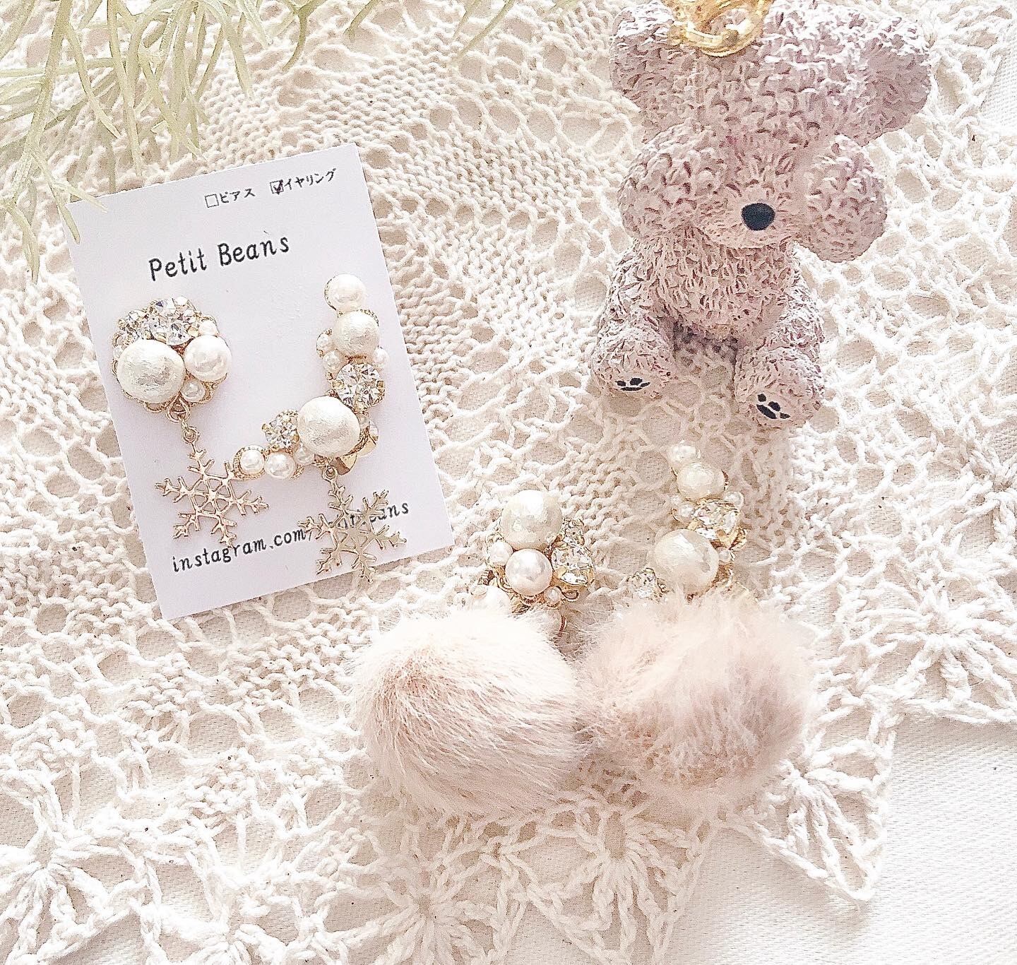 雪の結晶のチャーム付きスワロフスキーとコットンパールがいっぱいの上品なイヤーカフです。